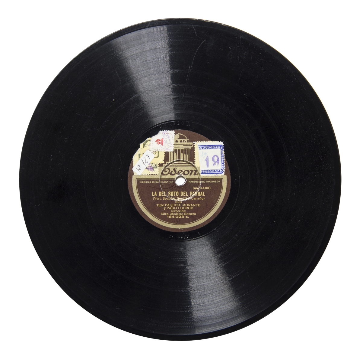 Música para soprano, barítono y orquesta.; Etiqueta marrón chocolate con el logo de Odeón y letras en dorado con las siguiente inscripción: "Fabricado en Barcelona por Transoceanic Trading Cº"; Cara A: 3 sellos-timbre con el fondo amarillo y la palabra Odeón en verde con tres firmas sin identificar; 1 sello con fondo blanco y el logo de Odeón en rojo, con la firma de "P. Gorgé" en tinta azul; pegatina con el fondo blanco y el número "19" escrito en tinta azul -- Cara B: 4 sellos-timbre con el fondo amarillo y la palabra Odeón en verde con cuatro firmas sin identificar; 1 sello con fondo blanco y el logo de Odeón en rojo, con la firma de "P. Gorgé" en tinta azul.; Sistema de grabación eléctrica "W" (Western Electric) grabado en el disco