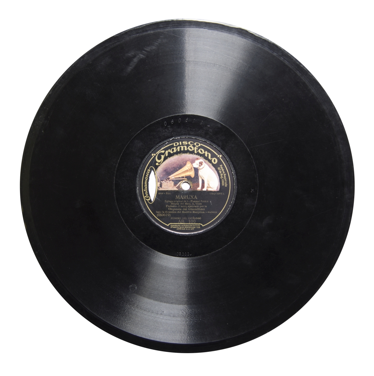 Música para orquesta.; En la etiqueta: "Palabra registrada, nº de Reg. 11601"; Etiqueta marrón con el logo de La voz de su amo en color.; En ambas etiquetas, en letras doradas: "ESPAÑOL", "Coro ac. orq", "Contramarca"; Estreno: Teatro de la Zarzuela de Madrid el día 28 de mayo de 1914.; Catálogo general de discos marca "Gramófono", junio de 1917, p. 108; Catálogo general de discos marca "Gramófono", junio de 1917, p. 108