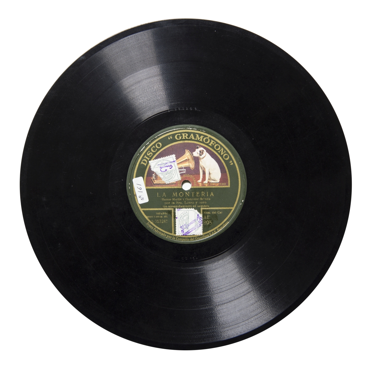 Música para soprano, barítono, coro y orquesta.; Cara A: etiqueta verde con el logo de "La Voz de su Amo" y letras doradas con las inscripciones: "Disco Gramófono", "Marca registrada. La Voz de su Amo", "Disco fabricado por la Compañía de Gramófono S.A.E Barcelona", "ESPAÑOL", "Soprano y coro ac. orq.", "Núm. del cat. AE 895" -- Cara B: las mismas excepto "Barit. y coro ac. orq."; 2 sellos-timbre de color verde y blanco con el logo de La Voz de su Amo y la inscripción: "Cía del Gramófono, S.A.E. Pagados los derechos de reproducción fonográfica" y firmas en tinta violeta de "J. Guerrero" y "J. Ramos" en ambas caras.; Catálogo general de discos marca "La Voz de su Amo", julio 1927, p. 184; Catálogo general de discos marca "La Voz de su Amo", julio 1927, p. 184
