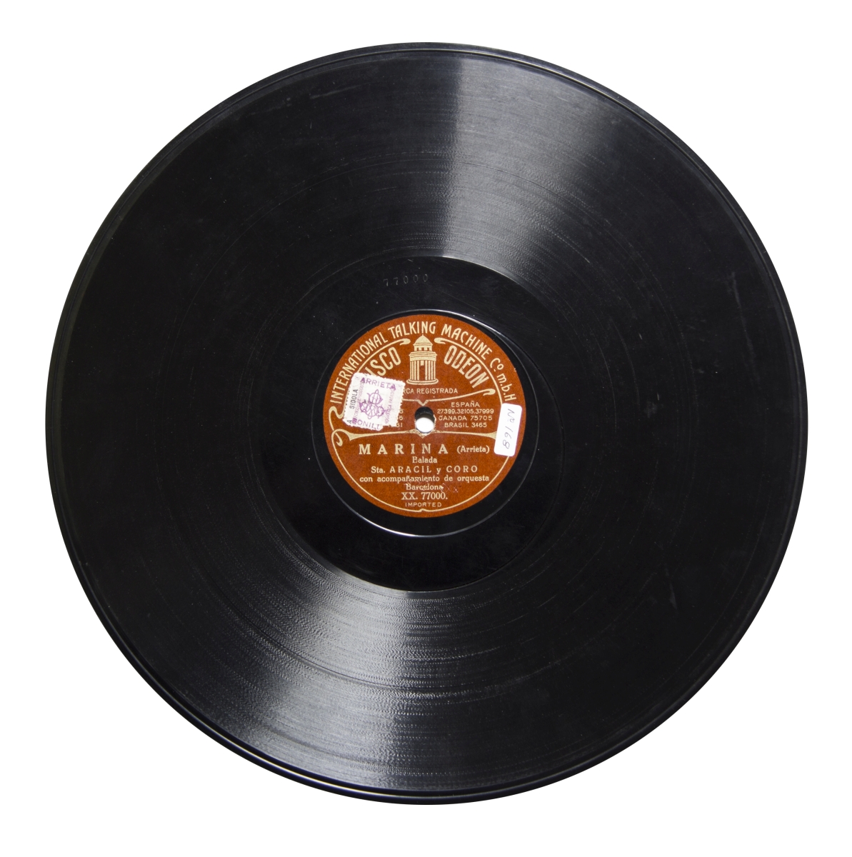 Música para voz, coro y orquesta.; Etiqueta marrón con el logo de Odeon en dorado y las inscripciones: "International Talking Machine, Cº m.b.H.", "Disco Odeon", "Marca registrada", "[Patentes: Suiza 23496, Italia 92416, Turquía 1331], España 27399, 32105, 37999, Canadá 75705, Brasil 3465", "Barcelona", "Imported"; Estreno: Teatro Circo de Madrid el día 21 de septiembre de 1855.; Sello-timbre con dibujo violeta de "SIDOLA. Derechos de reproducción fonográfica pagados" con la firma de "Arrieta. Bonill[a]" en ambas caras.; Catálogo general de discos dobles Odeón, 1922, p. 19; Catálogo general de discos dobles Odeón, 1922, p. 19