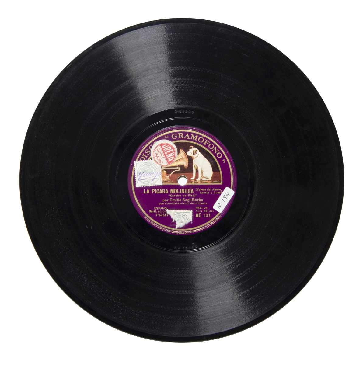 Música para barítono y orquesta y tenor y orquesta.; Etiqueta roja con el logo de "La Voz de su Amo", en color. Inscripciones: "Barit. ac. orq." (Cara A) y "Tenor ac. orq." (Cara B). En ambas caras: "REV. 78" y "ESPAÑOL"; Sellos y timbres de derechos de reproducción fonográfica pegados en ambas etiquetas.; Catálogo general de discos "La Voz de su Amo", julio 1930, p. 299; Catálogo general de discos "La Voz de su Amo", julio 1930, p. 299