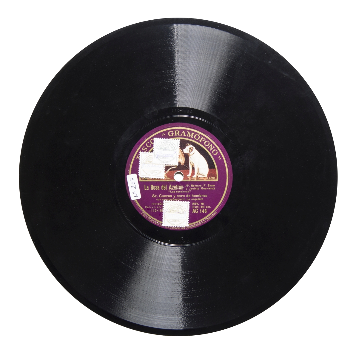 Música para recitador, coro (voces de hombres) y orquesta.; Etiqueta morada con el logo de La voz de su amo en color.; En las etiquetas, en letras doradas: "REV. 78", "ESPAÑA", "Duo", "Bar. y c. ac. orq."; Sellos de derechos de reproducción pegados en ambas caras.; Catálogo general de discos "La Voz de su Amo", enero de 1933, p. 75; Catálogo general de discos "La Voz de su Amo", enero de 1933, p. 75