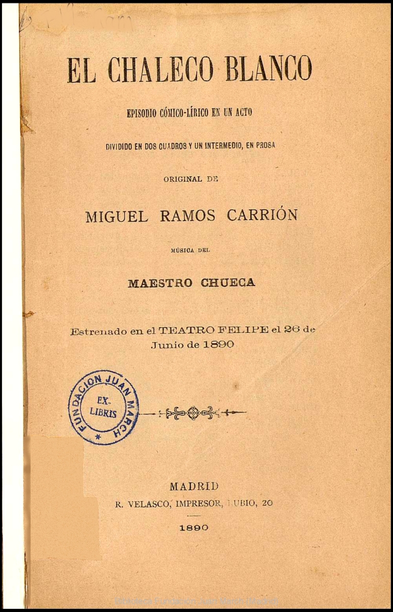 - Título: El chaleco blanco:episodio cómico-lírico en un acto dividido en dos cuadros y un intermedio, en prosa