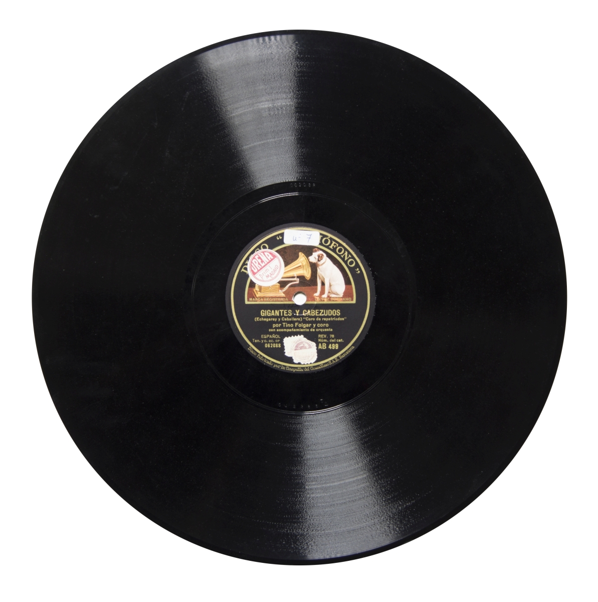 Música para voz, coro y orquesta.; Etiqueta negra con el logo de la compañía "La Voz de su amo". Incluye las siguientes inscripciones: "Español", "Ten. y c. ac. or" y "Rev. 78"; Estreno (Alma de Dios): Teatro Cómico [de Madrid], el 17 de diciembre de 1907.; Estreno (Gigantes y cabezuedos): Teatro de la Zarzuela en la noche del miércoles 29 de noviembre de 1898.; Sello del distribuidor en ambas caras: "Ureña. Prim 1, Madrid" en colores rojo y blanco. En Cara B: sello-timbre de "Cía. del Gramofono (S.A.E.). Pagados los derechos de reproducción fonográfica [firma ilegible]"