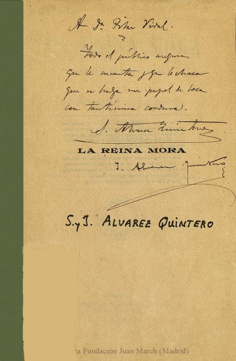 - Nota: Nº de personajes: 13 et al. (8 h. y 5 m.); Estreno: Teatro de Apolo (Madrid), 11 de diciembre de 1903.; Dedicatoria autógrafa de los libretistas a la actriz Pilar Vidal.; Ejemplar falto de cubierta.