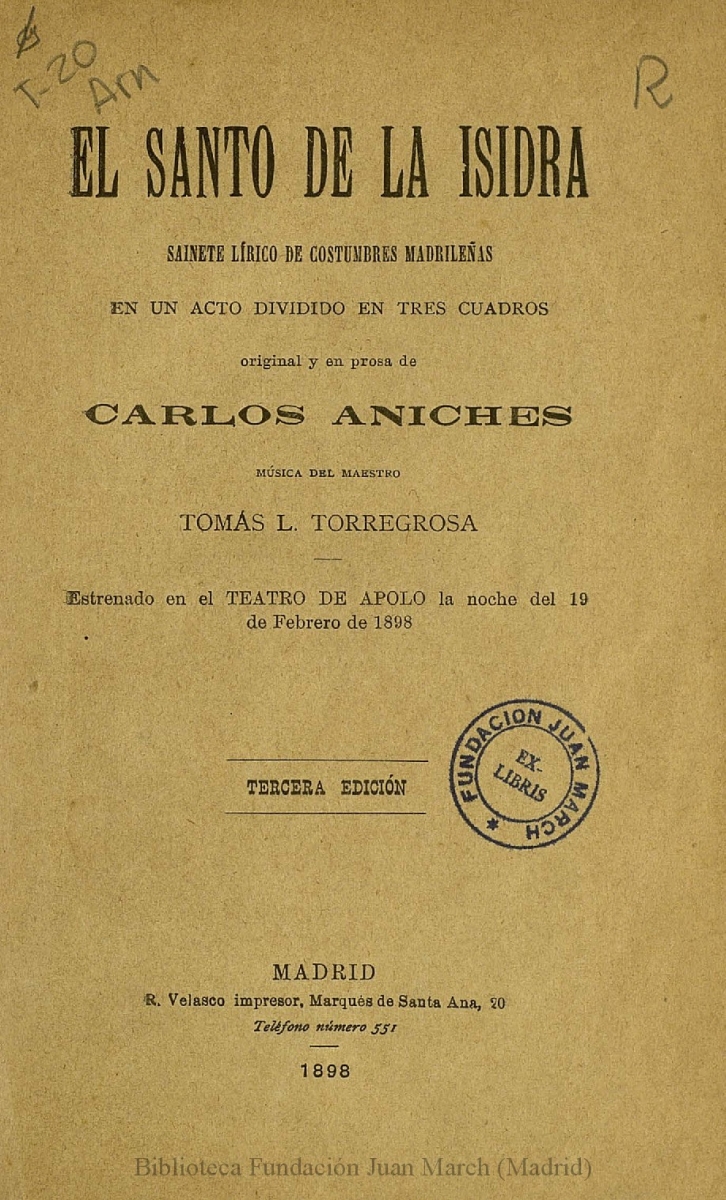 - Título: El santo de la Isidra:sainete lírico de costumbres madrileñas en un acto, dividido en tres cuadros original y en prosa