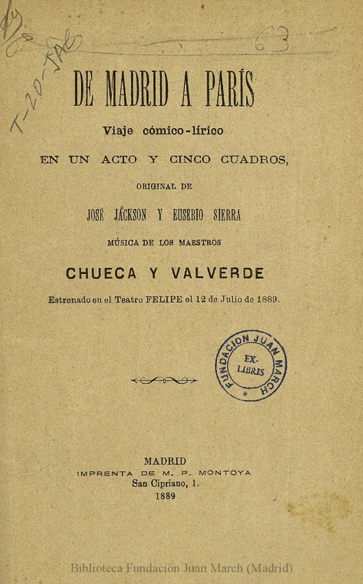 - Title: De Madrid a París:viaje cómico-lírico en un acto y cinco cuadros