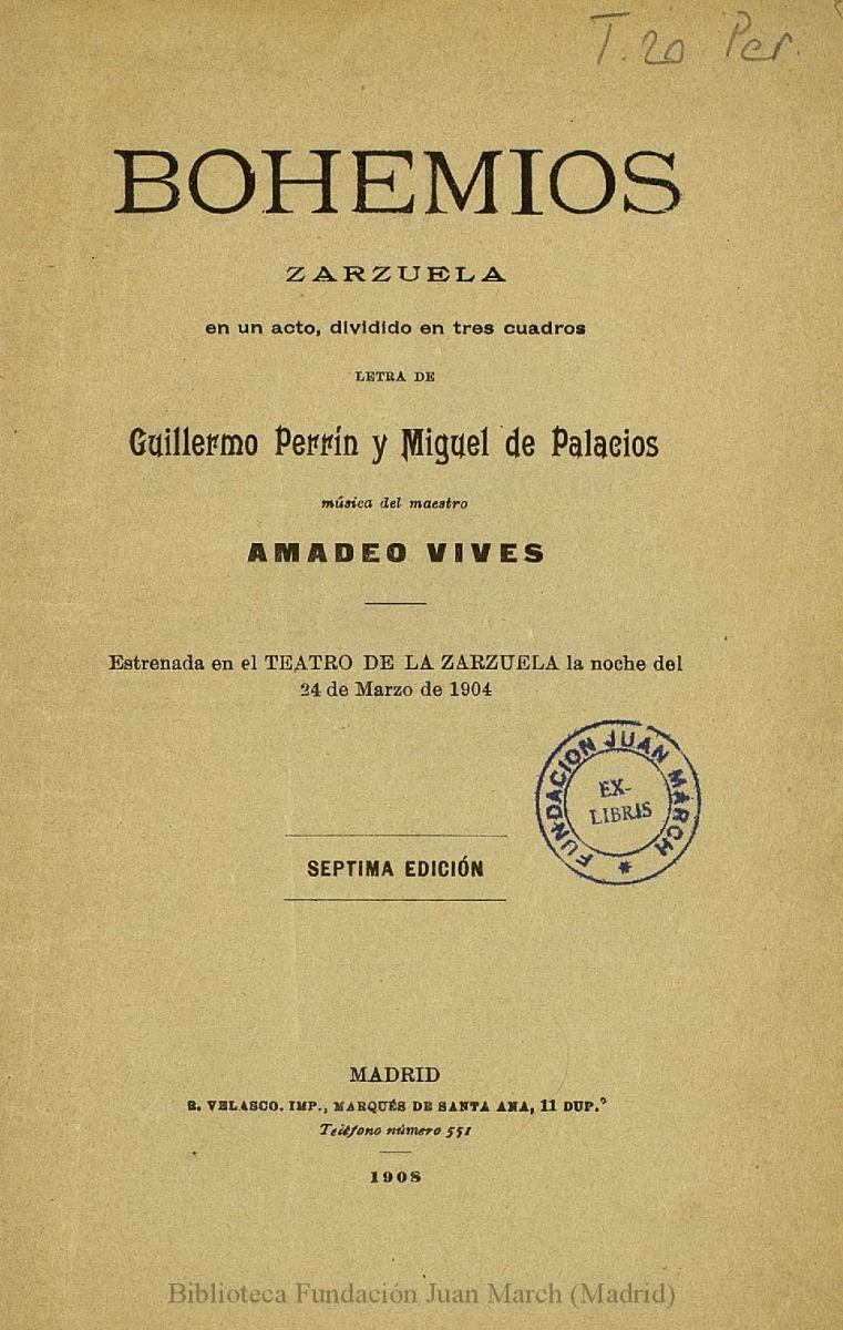 - Title: Bohemios:zarzuela en un acto, dividido en tres cuadros