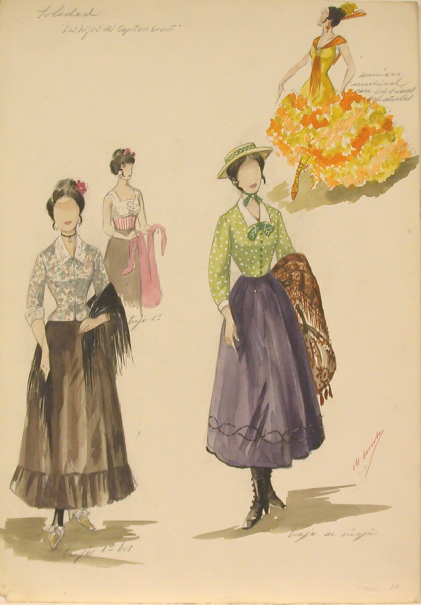 Boceto original del personaje de "Soledad", con trajes diferentes, firmado por el autor.; En el boceto aparece "Los hijos del Capitán Grant", título original de la novela de Julio Verne en que se basa esta obra.; Mención de responsabilidad creada a partir del contenido del documento.; La obra fue estrenada en el Teatro del Príncipe Alfonso (Madrid), el 25 de agosto de 1877.