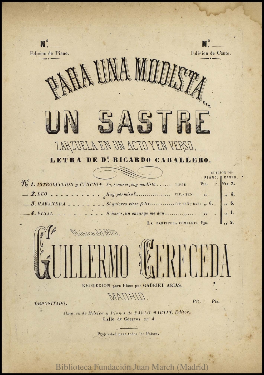 - Note: Música para soprano y piano.; Estreno: Teatro Catalán (Barcelona), 18 de agosto de 1874.; Fecha tomada de C. J. Gosálvez, La edición musical española hasta 1936.