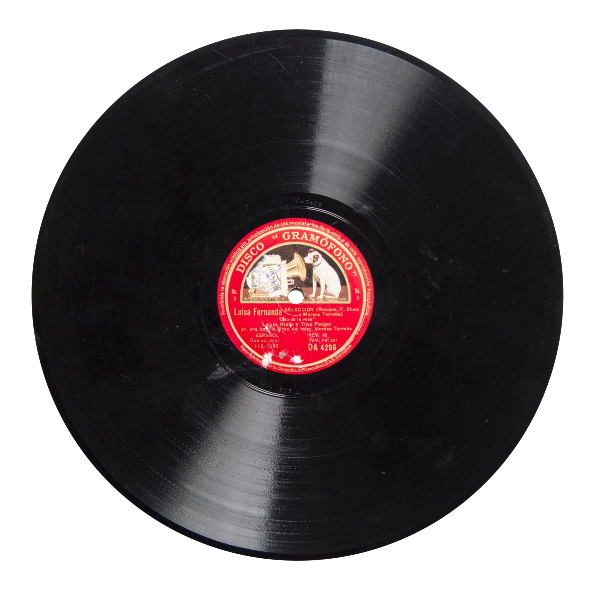 Música para soprano, tenor, barítono y orquesta.; Cara A: etiqueta roja con el logo de "La Voz de su Amo" y letras doradas con las inscripciones: "Disco Gramófono", "[Marca registra]da. La Voz de su Amo", "Disco fabricado por la Compañía de Gramófono S.A.E Barcelona", "ESPAÑOL", "Dúo ac. orq.", "REV. 78", "Núm. del cat. DA 4206" -- Cara B: las mismas excepto "Terc. ac. orq."; Estreno: Teatro Calderón (Madrid) el 26 de Marzo de 1932.; Restos de sellos y pegamento en las dos caras.
