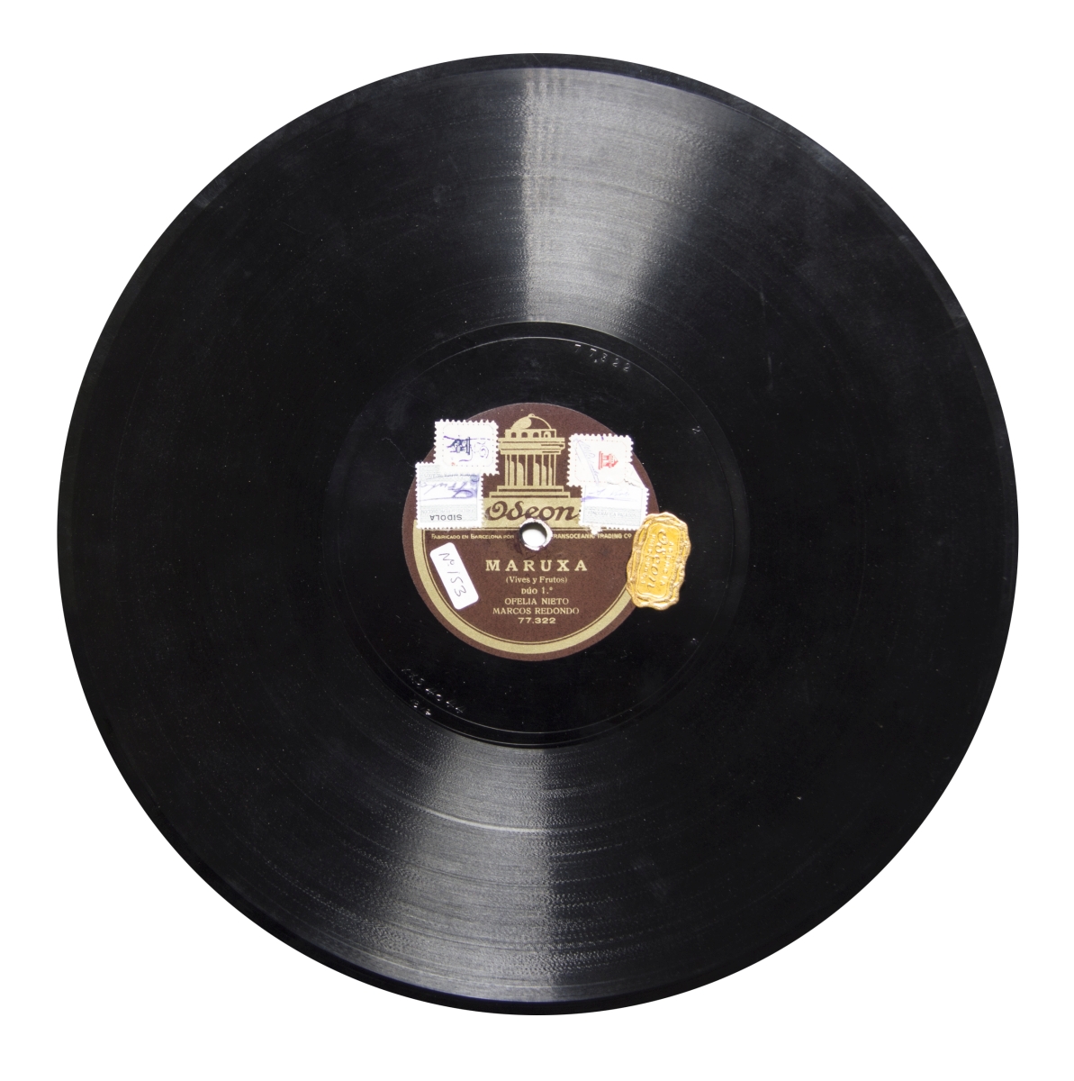 Música para soprano, barítono y orquesta.; Etiqueta marrón con el logo de Odeon en dorado.; Estreno: Teatro de la Zarzuela de Madrid, el 28 de mayo de 1914.; En las etiquetas de ambas caras, sellos del pago de los derechos de reproducción fonográficos.; Catálogo general de discos "Odeón", 1931, p. 39; Catálogo general de discos "Odeón", 1931, p. 39