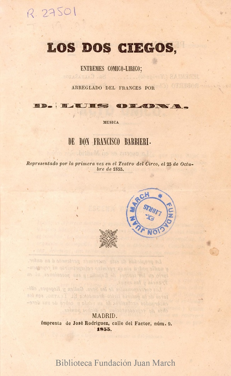 - Note: Nº personajes: 2 (2 h.); Estreno: Teatro del Circo, 25 de octubre de 1855.; Ejemplar falto de cubierta.