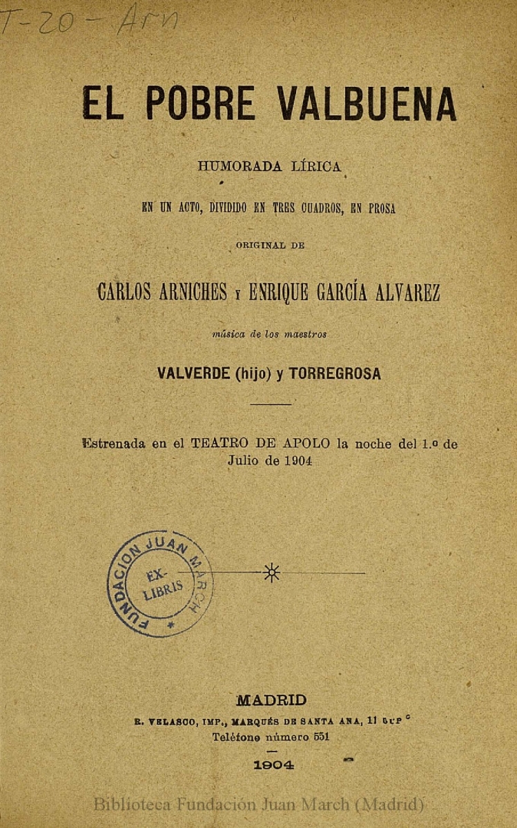- Title: El pobre Valbuena:humorada lírica en un acto, dividido en tres cuadros, en prosa