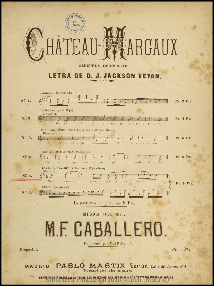 - Nota: Música para voces solistas y piano.; Estreno: Teatro de Variedades (Madrid), 5 de octubre de 1887.; En la cabecera: "Sirve también para piano solo"