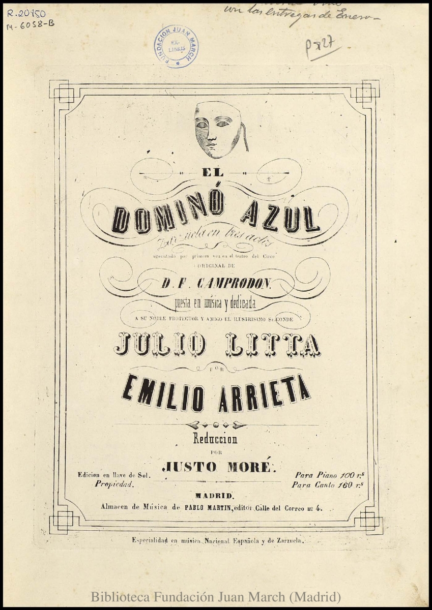 Música para voces solistas y piano.; Estreno: Teatro del Circo (Madrid), 19 de febrero de 1853.; Portada litografiada con orla, caligrafías y una máscara.; Encuadernación en holandesa. Encuadernada junto a "Los Magyares" y "El estreno de un artista" de Joaquín Gaztambide.; Fecha tomada de C. J. Gosálvez, La edición musical española hasta 1936.