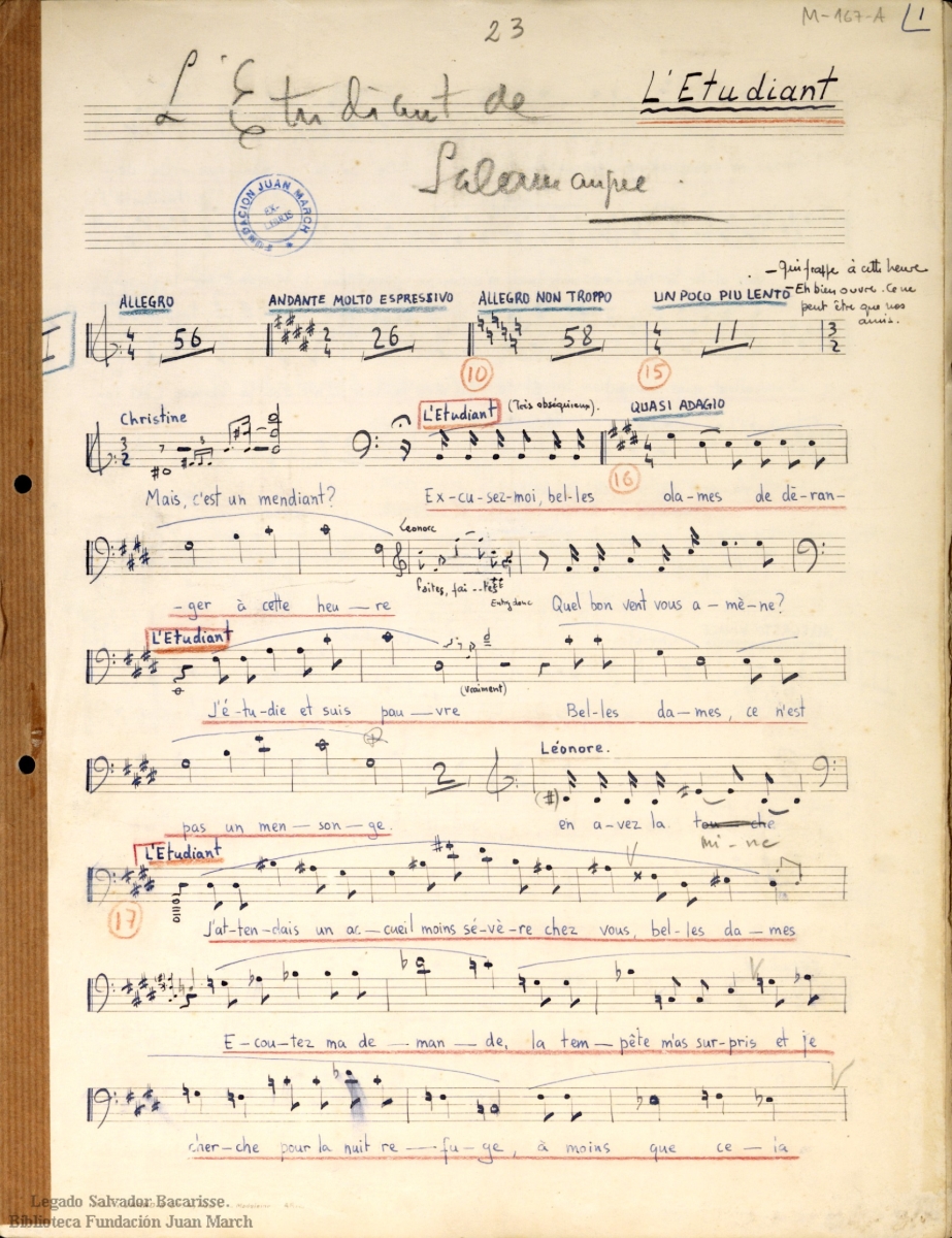 Plantilla: Vocs. sol. -- 2[1.2/picc] 2 2 2 -- 4 3 0 0 -- timb+ 2perc, arp -- cuerda. Los instrumentos de percusión son: tríangulo, caja, bombo, castañuelas.; Partitura autógrafa y partes manuscritas.; Reparto: Leonore (S), Christine (Mezzo-S), Pancrace (B), Blaise (T), Nicolas (T), L'Etudiant (Ba); Partes vocales: L'Etudiant, Léonore, Christine, Pancrace, Blaise, Nicolas.; Partes instrumentales: Flûtes I et II, 1er et 2e Hautbois, 1et et 2e Clarinettes, 1er et 2e Bassons, 1er et 2e Cors (en fa), 3er et 4e Cors (en fa), 1er et 2e Trompettes (en Ut), 3e Trompette (en Ut), Timbales, (Triangle, tambour, G. Caisse, Castagnettes), Harpe, 1rs Violons (2), 2ds. Violons (2), Altos (2), Violoncelles (2), C. Basses.; La partitura está encuadernada en holandesa.; En p. 19 de la parte de viola II: "Monte Carlo (Mai 1955)"; Texto en francés.; Legado Salvador Bacarisse.