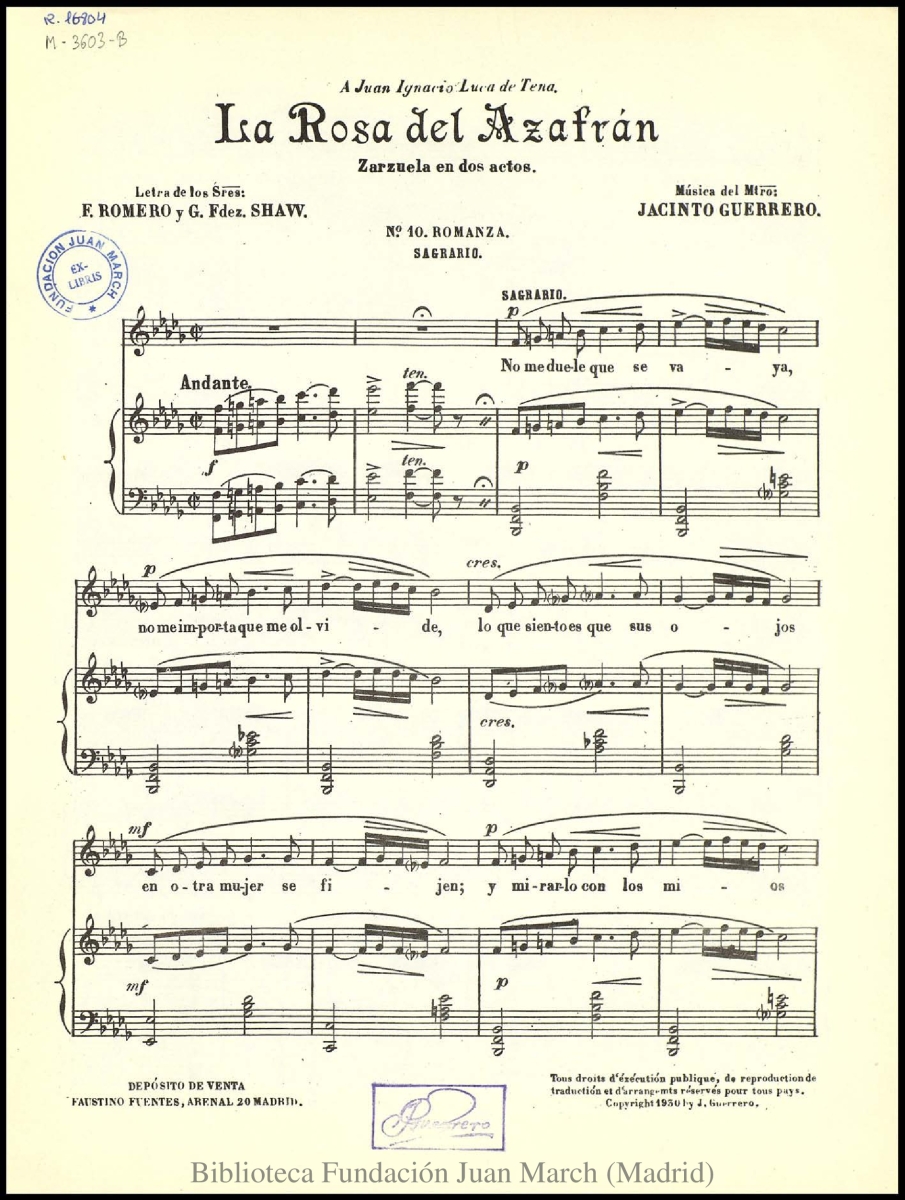 - Nota: Música para soprano y piano.; Estreno: Teatro Calderón (Madrid), 14 de marzo de 1930.; Cubierta con caligrafías a una tinta.