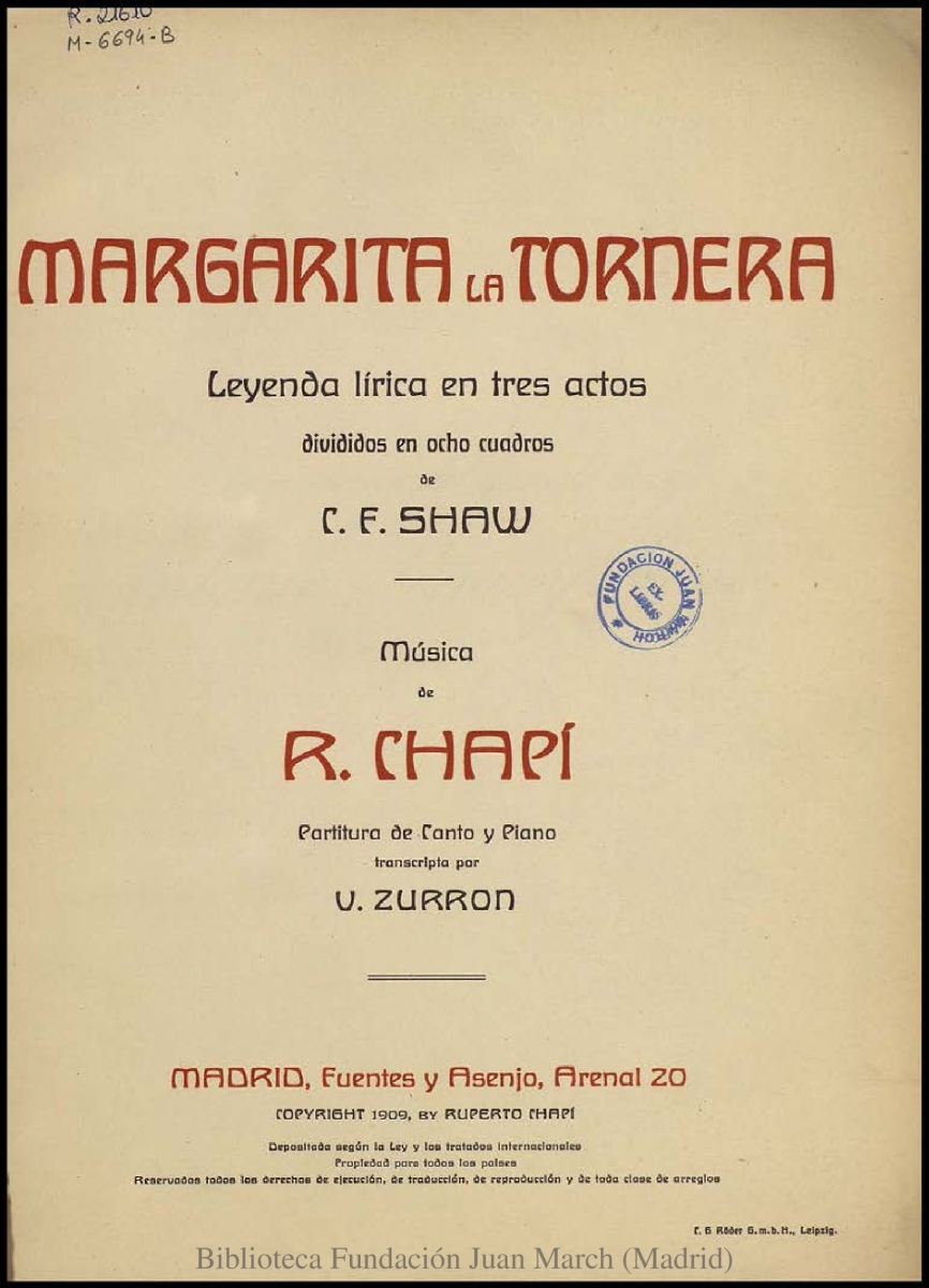 Música para voces solistas, coro y piano.; Estreno: Teatro Real (Madrid, 24 de febrero de 1909.; Reparto: Margarita (Tiple dramática), Sirena (Tiple ligera), La tornera, Don Juan de Alarcón (Tenor), Don Lope de Aguilera (Barítono), Gavilán (Bajo), El sacristán de las monjas, Un capellán.; Partitura dedicada: "A la memoria del querido amigo Antonio Peña y Goñi"; Encuadernada con cartón rojo, en tapa anterior título en letras doradas.