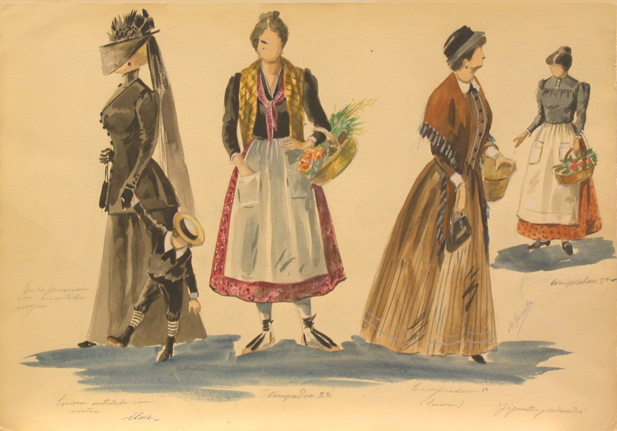 Nota: Boceto original de los personajes de "Clara" y tres compradoras firmado por el autor.; Mención de responsabilidad creada a partir del contenido del documento.; La obra fue estrenada en el Teatro de la Zarzuela (Madrid), el 29 de noviembre de 1898.