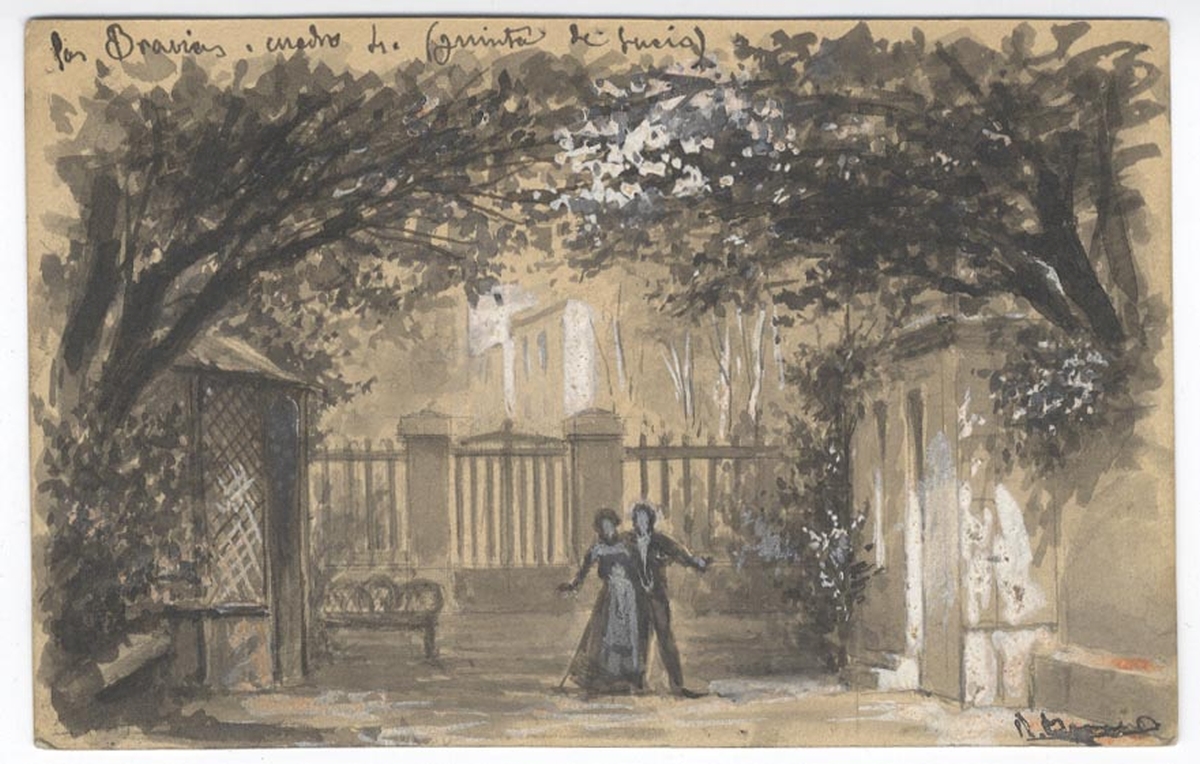 Nota: Boceto original para el cuadro cuarto de la obra, "Quinta de Lucio", firmado por el autor.; Mención de responsabilidad creada a partir del contenido del documento.; La obra fue estrenada en el Teatro de Apolo (Madrid), el 12 de diciembre de 1896.