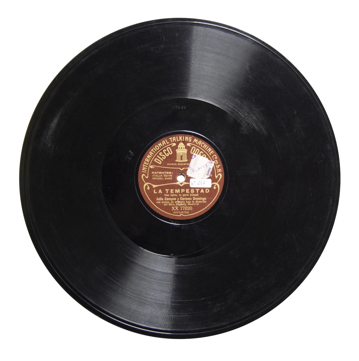 Música para dos sopranos y orquesta.; Duración: 2 min 53 seg (Cara A) ; 3 min 51 seg (Cara B); Etiqueta marrón con el logo de Odeon en letras doradas e inscripciones: "Imported", "Patentes. Italia [...]"; Estreno: Teatro de la Zarzuela Madrid el 11 de marzo de 1882 con libreto de Miguel Ramos Carrión.; Sellos de derechos de reproducción en ambas caras.