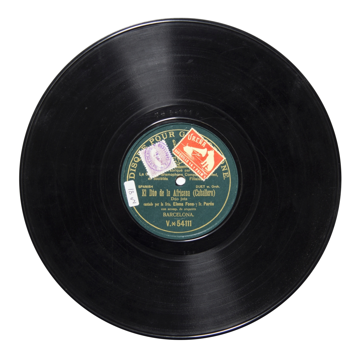 Música para soprano, tenor y orquesta.; Duración: 3 min, 42 s (Dúo jota "No cantes más La Africana"); Etiqueta verde con el logo de la compañía Gramophone prácticamente tapado por los sellos, con las letras en dorado y las siguientes inscripciones: "Disque pour G[rampho]ne", "Fabrique para La C[ia] Gramophone Compa[...] ted, et Sociètès Filiales", "SPANISH", "DUET w. Orch."; Estreno: Teatro Apolo de Madrid la noche del 13 de mayo de 1893.; Disco grabado por una única cara.; Sello-timbre en color violeta y blanco con el logo de La Voz de su Amo, y "Herederos de Caballero", y sello de distribuidor "Ureña. Barquillo 14 y Prim 1"