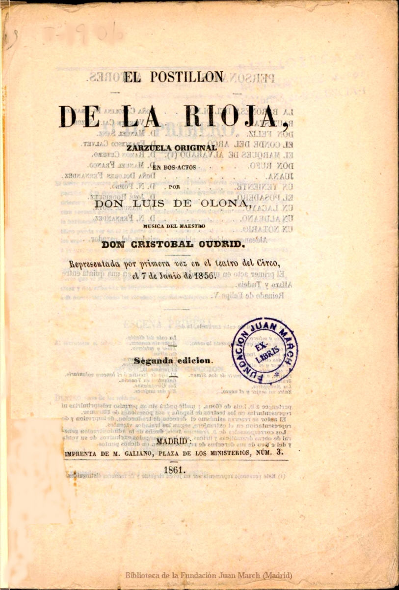 - Título: El postillón de la Rioja:zarzuela original en dos actos