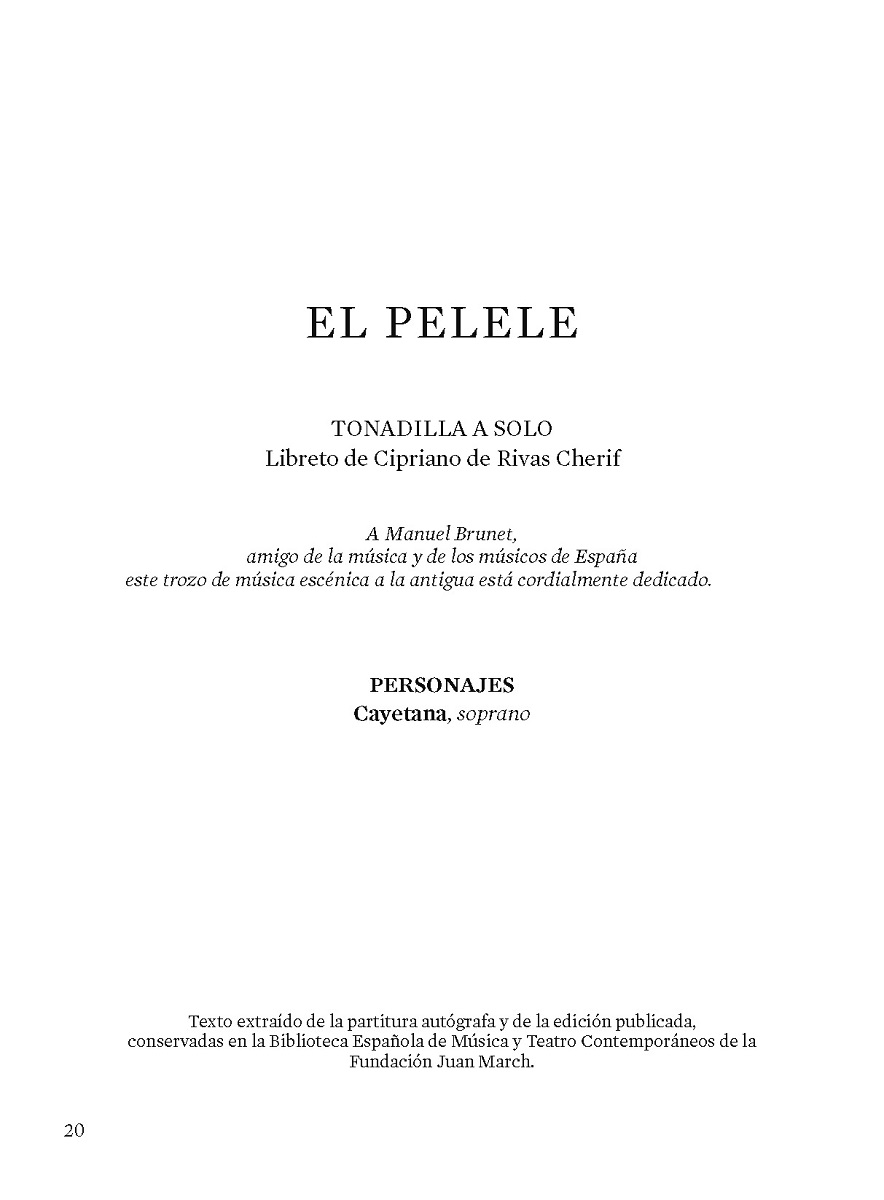 Reparto: Soprano (Cayetana); Texto extraído de la partitura autógrafa y de la edición publicada, conservadas en la Biblioteca Española de Música y Teatro Contemporáneos de la Fundación Juan March.; La edición del texto pertenece al programa de mano de la representación celebrada en la Fundación Juan March (Madrid), en abril de 2016, dentro del ciclo Teatro musical de cámara.; Software requerido: Adobe Acrobat.